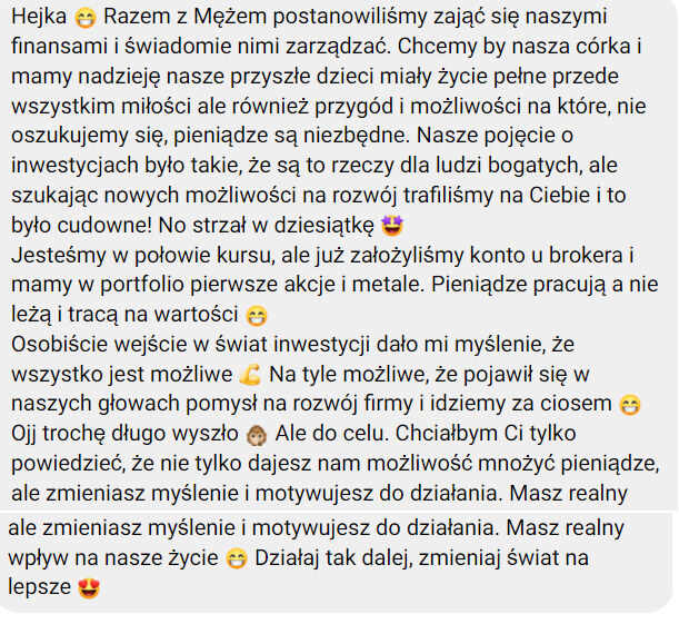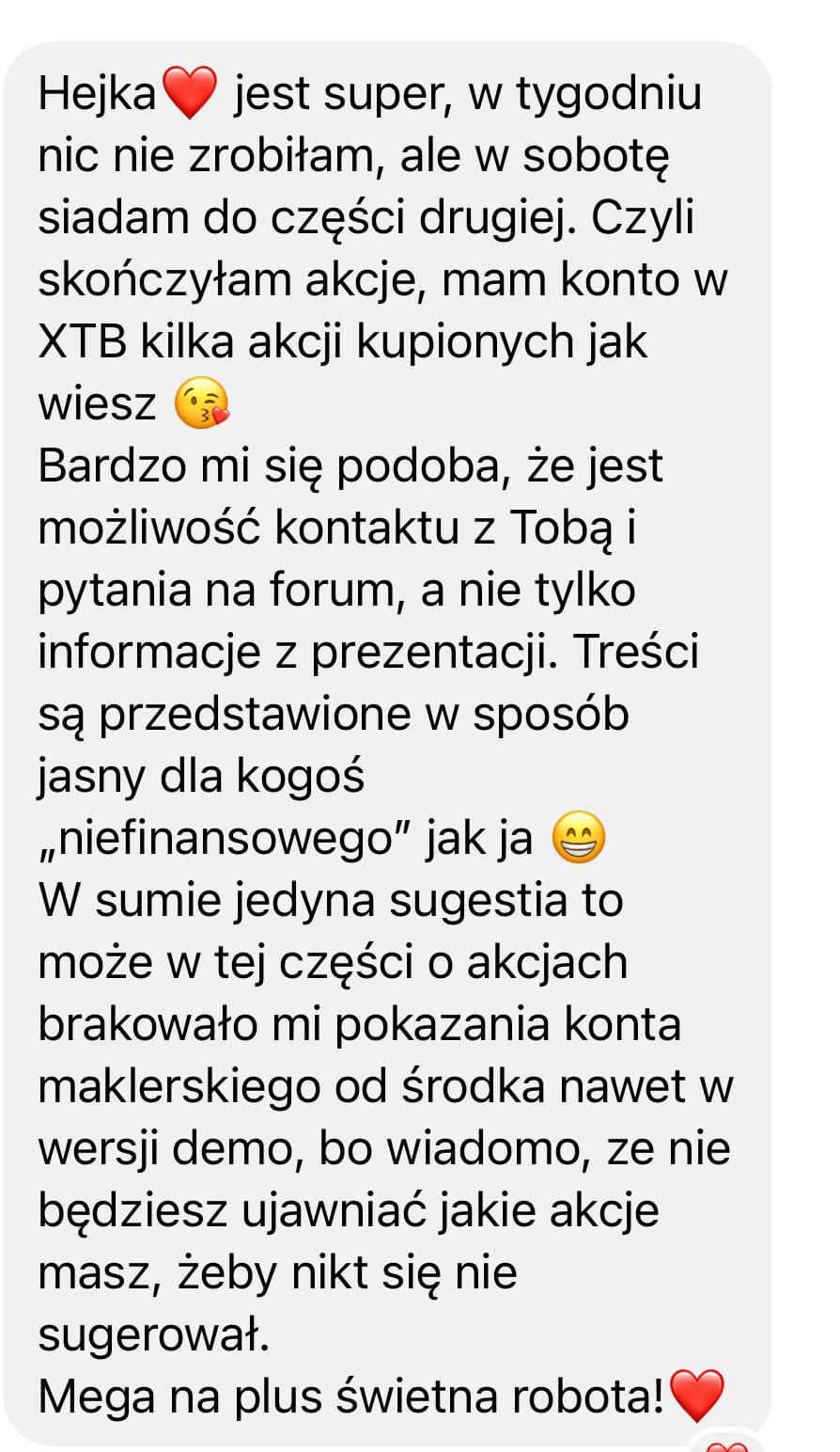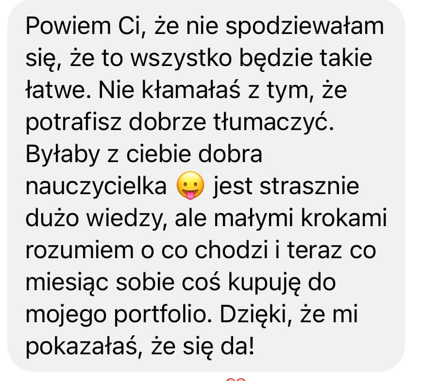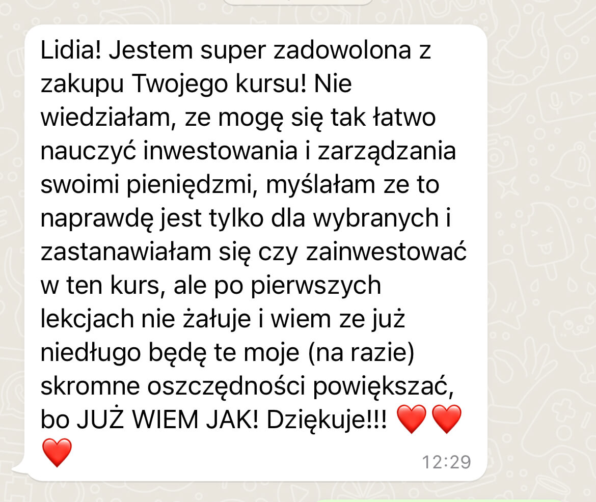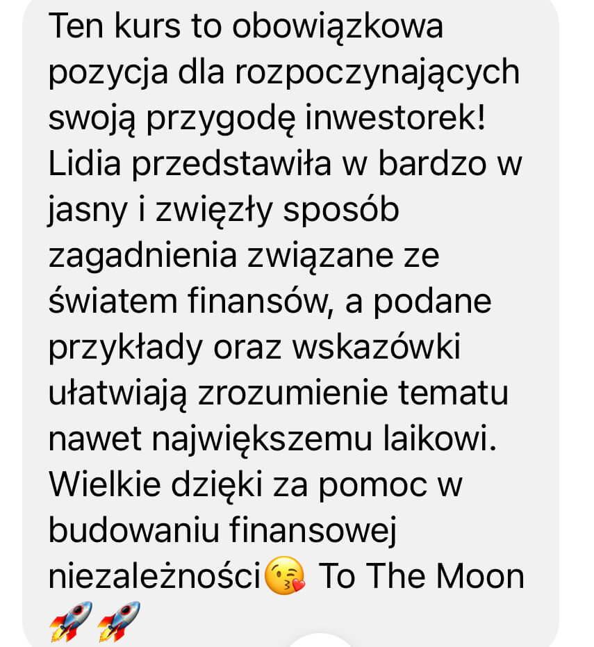 Dzięki moim wskazówkom krok po kroku stworzysz swój plan finansowy i już CAŁE ŻYCIE BĘDZIESZ MIAŁA POCZUCIE, ŻE WIESZ CO ROBISZ I WIESZ JAK POMNAŻAĆ SWOJE OSZCZĘDNOŚCI.