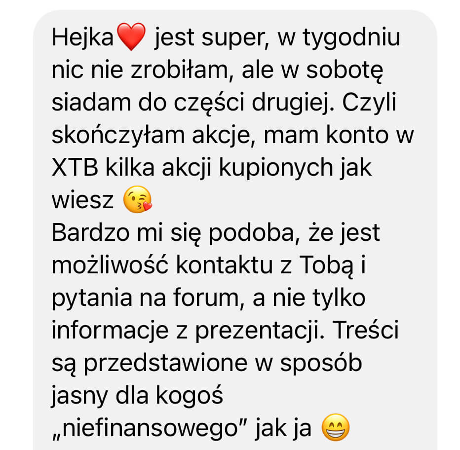 Na Kurs składają się materiały video, i pdfy. Każdy moduł kończy się zadaniem dla Ciebie - tak abyś po ukończeniu kursu miała zadbane finanse. W materiałach poprowadzę Cię krok po kroku, kliknięcie za kliknięciem, dlatego będziesz dokładnie wiedziała, co robić, aby uzyskać jak najlepsze rezultaty.